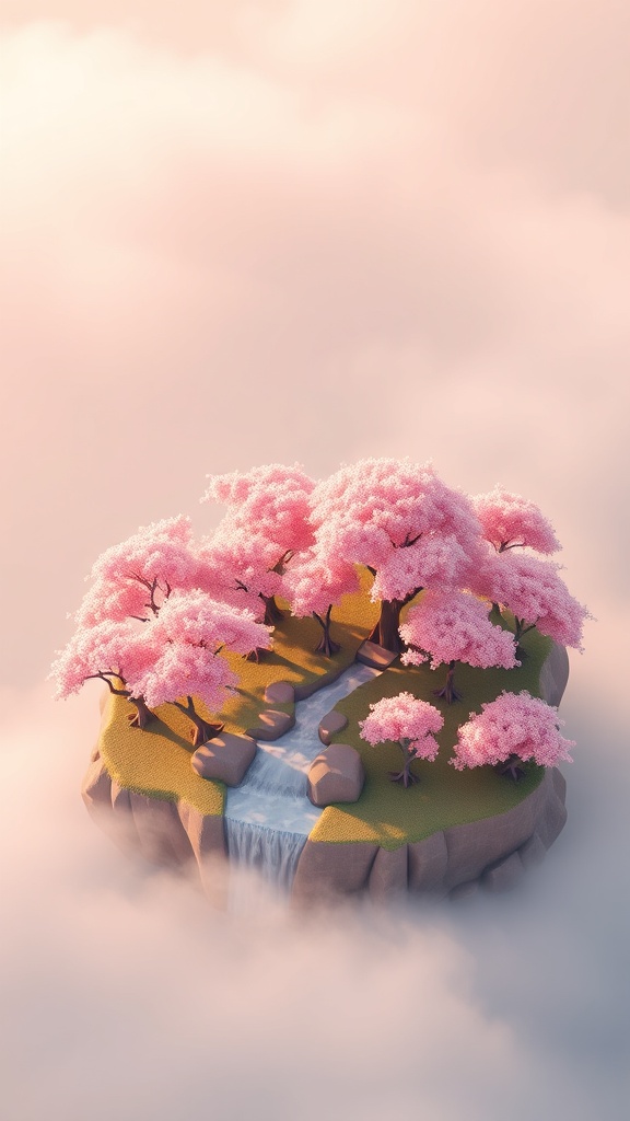 View this AI-generated image featuring a charming small matte low poly isometric cherry blossom grove island gentle pink cascades atmospheric mist warm late afternoon light delicate shadows popular on artstation 3d render reminiscent of monument valley aesthetics fez video game influence serene envi