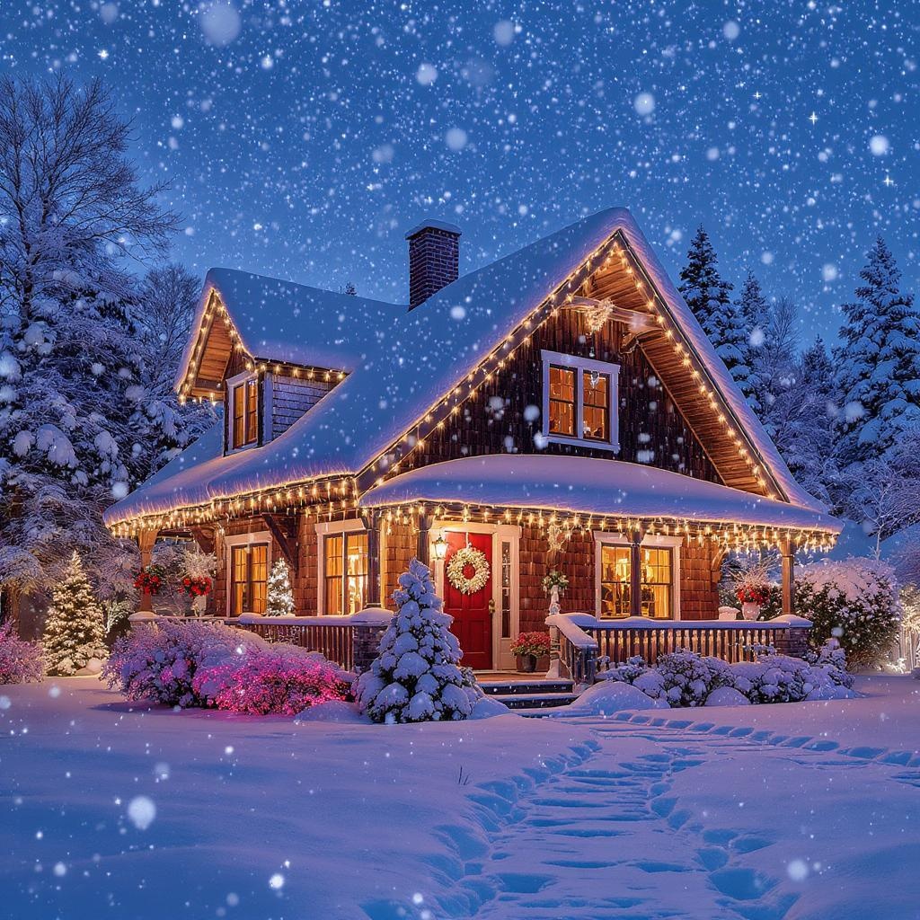 A cozy, snow-covered house adorned with twinkling Christmas lights and festive decorations, surrounded by gently falling snowflakes and a starry night sky, creating a magical, cinematic atmosphere in high-definition quality.
