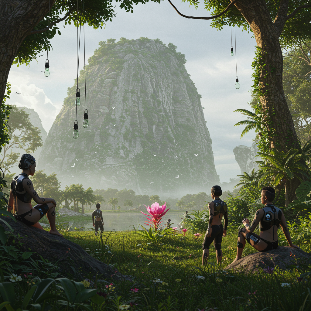 In a utopian society where cybernetic implants review and filter human thoughts, removing negativity and rewarding positivity with pleasing stimuli, a hacker group hacks into the system, accessing the darkest thoughts of individuals around them. This reveals a mesmerizing connection to a quest where a diverse group of travelers ventures to a distant land in search of a magical flower believed to possess incredible healing powers. Captured through the lens of a Fujifilm X-T4 Mirrorless Camera, the travelers sit enigmatically in an asteroid field, adorned with pendants, drawing inspiration from the works of Lee Friedlander. As they traverse a vast marsh and the shadowy expanse of Cheyenne Mountain, they employ microwave vision to guide their way. The expedition leads them to a vibrant jungle clearing, reminiscent of the magic realism style of Irving Penn. Cinematic FX, variable lens types, and lighting sources blend with photofilm color to create a science fiction dieselpunk atmosphere akin to Steven Cormann's art, captured photorealistically with a Hasselblad X1D - 50c. Long exposures and ultra-HD rendering showcase natural and moody lighting in hyper-realistic detail, with vibrant, highly detailed shots in the vein of Gesaffelstein's 'Pursuit.' This rich tapestry woven with natural textures, volumetric lighting, and cinematic rendering provides an epic scene full of fine detail, captured with the highest quality in RAW format using a DSLR, under softly lit, overcast skies in 8K UHD resolution.
