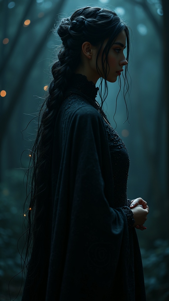 A mystical sorceress stands enveloped in darkness, her silhouette elegantly captured in a hyper-realistic, highly detailed masterpiece of character design. Ethereal volumetric lighting thinly veils her, casting mesmerizing shadows that dance around her figure. Tiny fairy lights twinkle softly in her luscious midnight hair, intricately woven into elaborate braids that reflect her enigmatic aura. Her eyes glint with a knowing intensity, enhanced by the ultra-realistic textures of her flawless skin. Intricate patterns, reminiscent of ancient runes, subtly cover her flowing robes, which shimmer with a soft luminescent glow. The scene is captured with stunning HDR clarity, enhancing the contrast between shadow and light, emphasizing every delicate detail in a breathtaking vertical panorama.