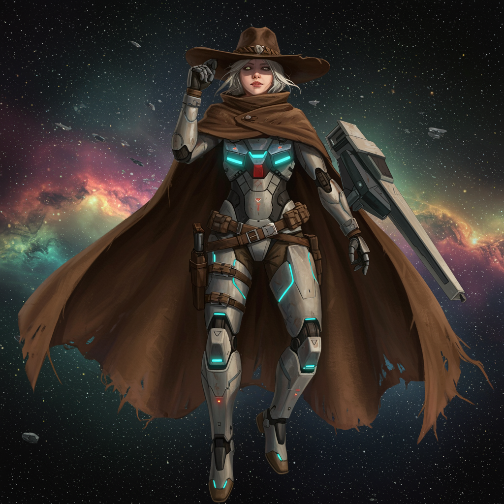 A daring and bold Space Cowgirl, she exudes a sense of fearlessness with her distinctive fusion of styles. Her worn outer cloak flutters dramatically in the weightlessness of space, adding to her enigmatic allure. Atop her head rests a timeworn, wide-brimmed hat, angled just enough to shade her steely, determined eyes. Her ensemble is completed by a sleek, futuristic gundam armor with luminous accents, seamlessly integrated with her bodysuit. The harmonious blend of classic western and advanced technology creates an extraordinary vision of a spacefaring adventurer.
