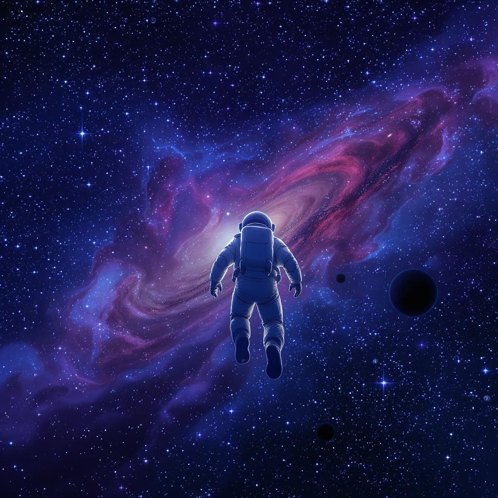 A breathtaking space-themed artwork showcasing the mesmerizing beauty of swirling nebulas and shimmering stars, accompanied by an astronaut, all under a dark blue palette, with an ethereal touch. The image captures the wonder and vastness of space, blending celestial elements in a harmonious dance of color and light.