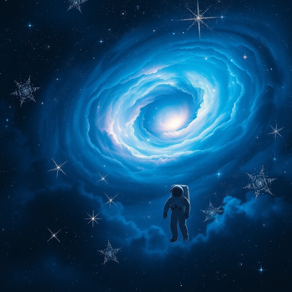 View this AI-generated image featuring a breathtaking space themed artwork showcasing the enchanting elegance of swirling nebulas and shimmering stars with an astronaut amidst the cosmic scene the composition features a mysterious deep blue color palette evoking a sense of wonder and adventure the e
