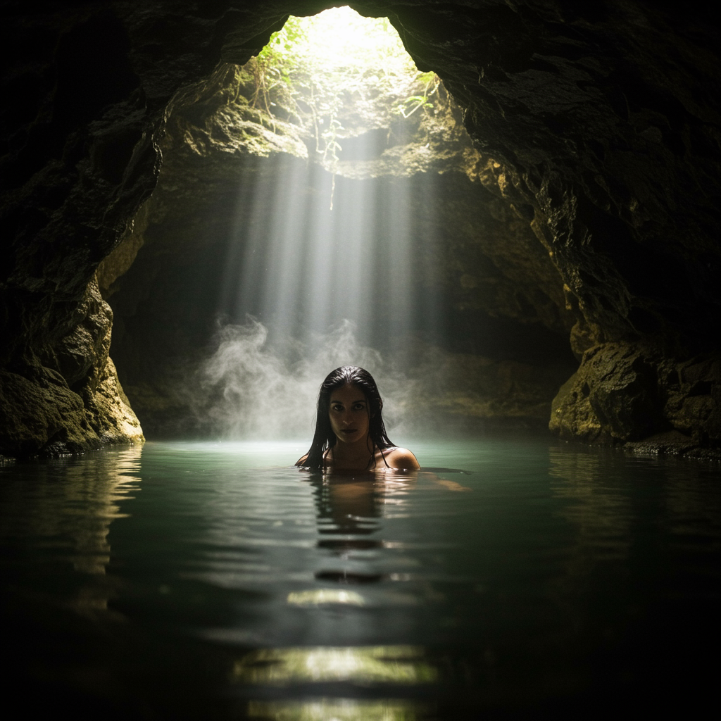 A warm spring nestled within the shadows of a dimly lit cave, wisps of steam gracefully rising from the gently rippling water. An Indian woman with cascading black hair swims effortlessly, her gaze mysterious and entrancing as she meets the viewer's eyes. A shard of sunlight filters through a fissure in the cave's ceiling, casting a gentle glow that dances on the water's surface, creating an ethereal silhouette around her figure amidst the mystical ambiance.