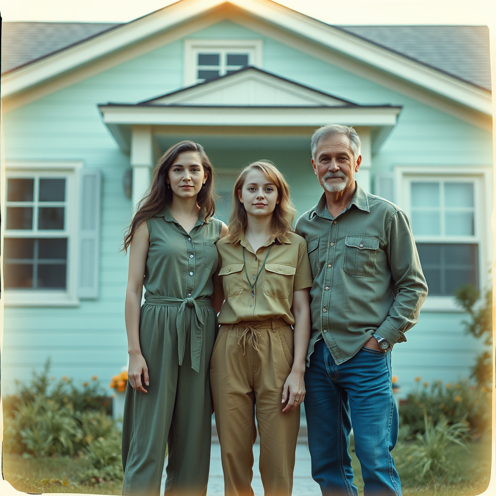 View this AI-generated image featuring a girl a woman and a man stand together in front of a vintage house bathed in soft light turquoise and light yellow hues reflective of the post 70s ego generation captured in a calotype inspired style reminiscent of alex hirsch s aesthetic and touching on the n