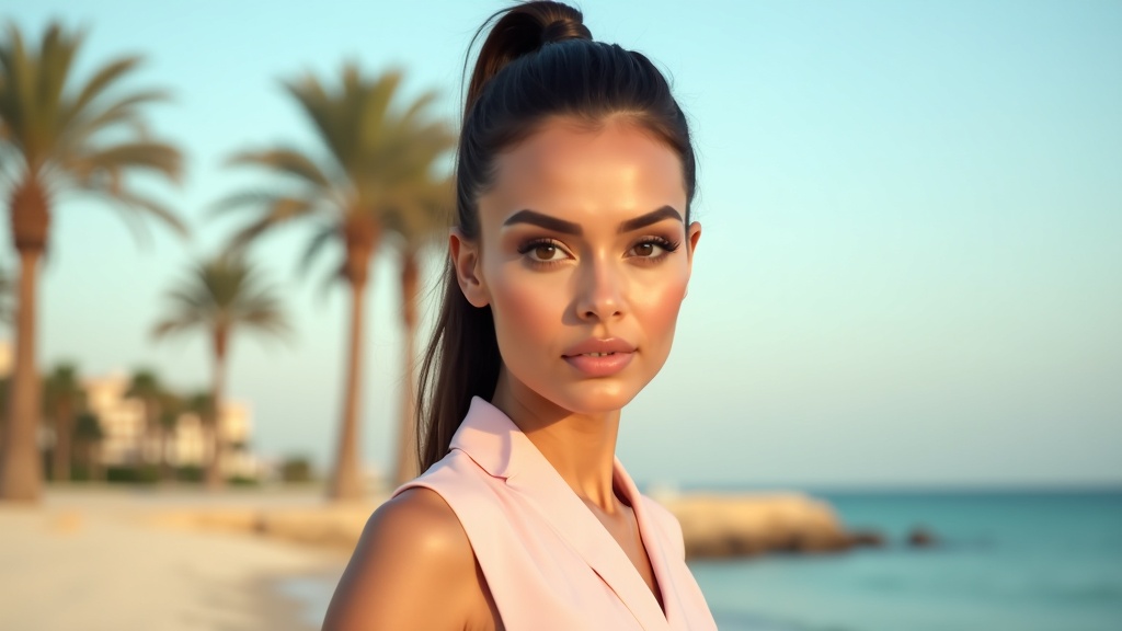 A woman stands confidently, facing the camera with a slight tilt of her head, her eyes locking with the lens in an engaging and powerful gaze. Her hair is styled in a sleek high ponytail with a few loose strands that gently frame her face. Her makeup subtly accentuates her eyes under perfectly shaped eyebrows, adding depth to her captivating expression. She is dressed in a sophisticated, pastel-colored summer dress, suitable for work, which complements the tropical setting. The backdrop suggests a vibrant city, reminiscent of Dubai or Taiwan, with exotic palm trees silhouetted against the clear sky. The climate appears hot and humid, enhancing the overall tropical ambiance. Her Middle Eastern complexion glows with vitality, accentuated by her skincare regimen, showcasing a flawless and brightened face.