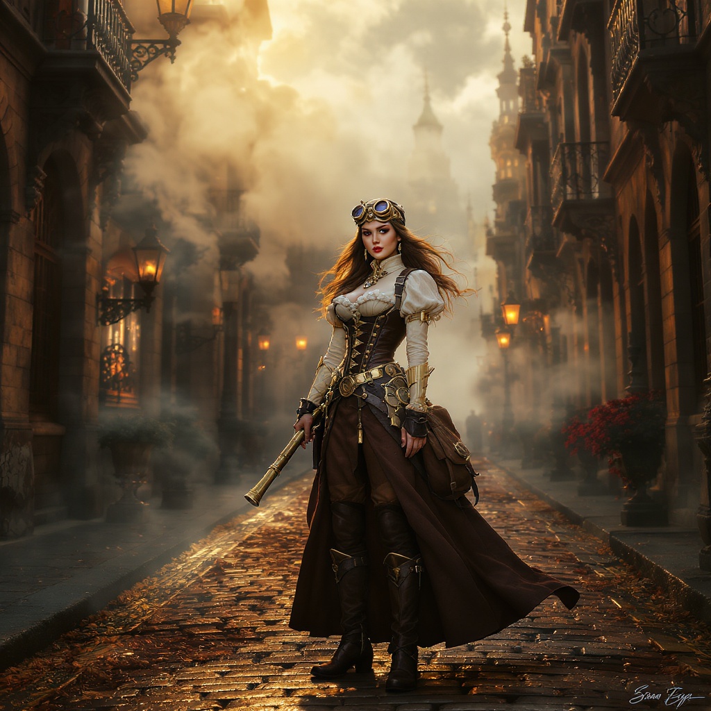 A female steampunk adventurer navigates a Victorian cityscape, her long wavy hair cascading around her shoulders, bathed in beautiful and dramatic lighting. Inspired by the style of Julie Bell, this scene is intricately detailed and captured in 8k for the best quality with an ultra-sharp focus. Volumetric fog envelops the surroundings, enhancing the atmospheric depth, while her dynamic pose adds a sense of movement and vitality. The city around her is filled with the charm of a bygone era, with cobbled streets and elaborate architecture, infused with a touch of steam-powered innovation. The narrative unfolds without the distraction of errors or imperfections, focusing solely on the artistry and elegance of this steampunk heroine within an enchanting Victorian setting.