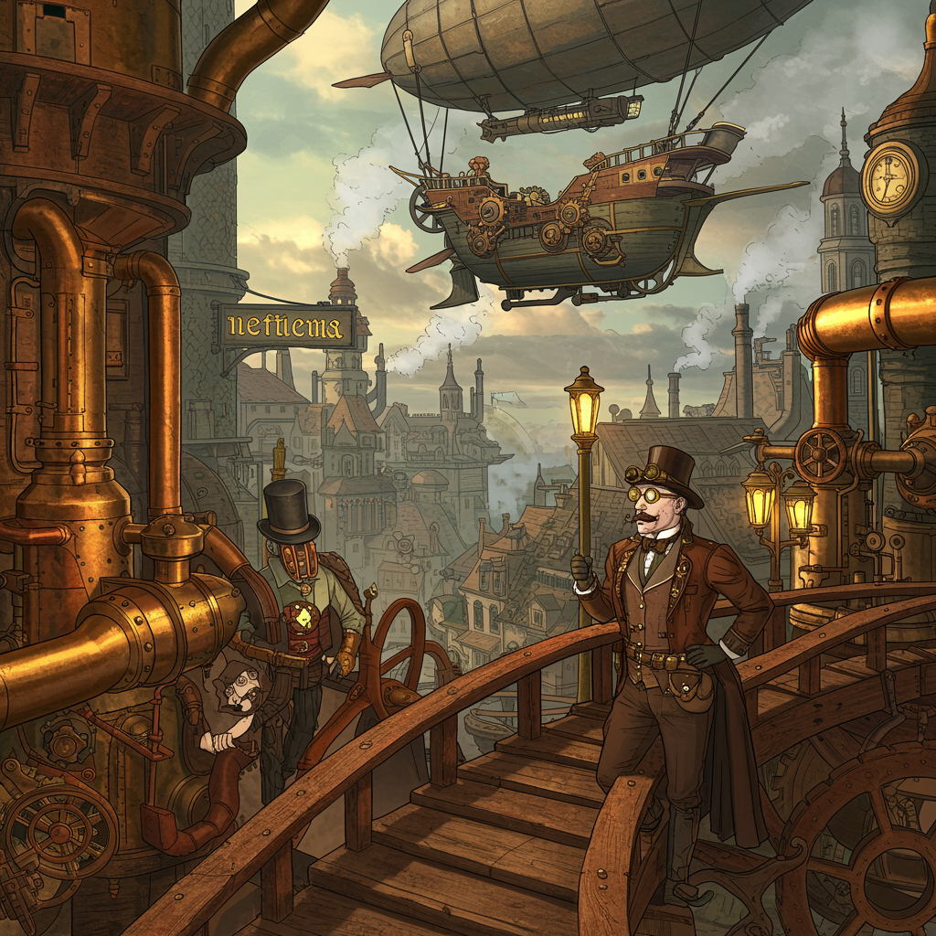 View this AI-generated image featuring steampunk inspired world vibrant intricate machinery high saturation and rich colors atmospheric brass and copper hues whimsical gears and cogs detailed victorian fashion infused with futuristic elements bustling urban landscapes with steam billowing from tower