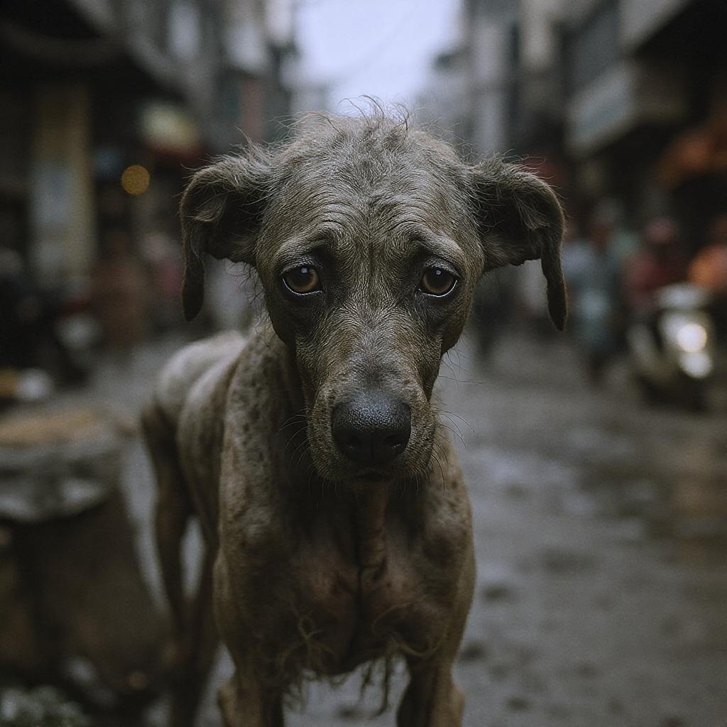 A forlorn stray dog, emaciated and grimy, with a skeletal frame and sorrowful eyes, standing on a bustling yet grimy street of Bangkok. Its fur is matted and unkempt, and it gazes directly into the lens, capturing a mix of vulnerability and resilience. The soft light casts gentle shadows, enhancing the poignant expression on its face. Captured with the nostalgic feel of film, reminiscent of Agfa Vista 200, the scene is framed in a balanced square aspect ratio, and the composition is artistically stylized, bringing out the depth of emotion and the harsh beauty of its urban environment.