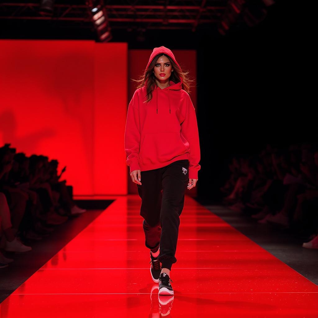 A woman strides confidently down the runway, her red hoodie and sweatpants creating a striking contrast against the vivid crimson backdrop. Her expression is one of fierce determination as the audience remains silhouetted, adding an element of mystery. The atmosphere is sleek and contemporary, infused with a bold, electrifying energy.