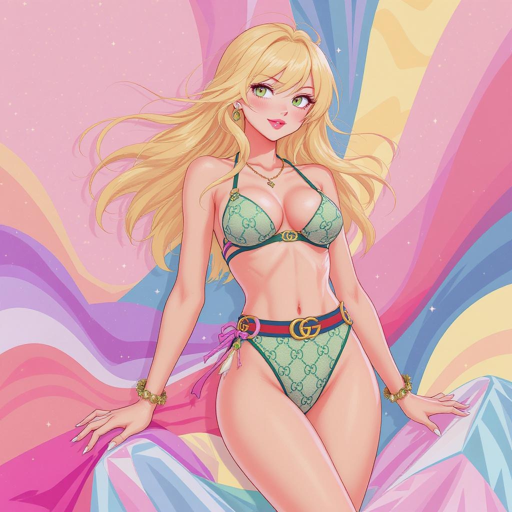 A woman striking a dynamic pose in beachwear designed by Gucci, influenced by Yanjun Cheng's style, portrayed in a digital art form. Her look seamlessly blends the charm of the lofi girl internet meme with the trending design aesthetics on Dezeen. This 3D render draws inspiration from artists like Beeple, Rhads, and Lois van Baarle, capturing the essence of retro anime in a vibrant cartoon style. The palette is awash with bright pastel colors, resulting in a beautiful artwork illustration that stands as both a catalog photo and a trending piece of artistic brilliance.