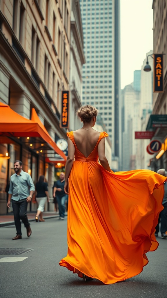 View this AI-generated image featuring a woman strolls gracefully down a bustling city street draped in an exquisite orange gown that flows with elegance evoking classic hollywood glamour captured in a candid moment reminiscent of iconic figures the scene is set against a minimalist white background