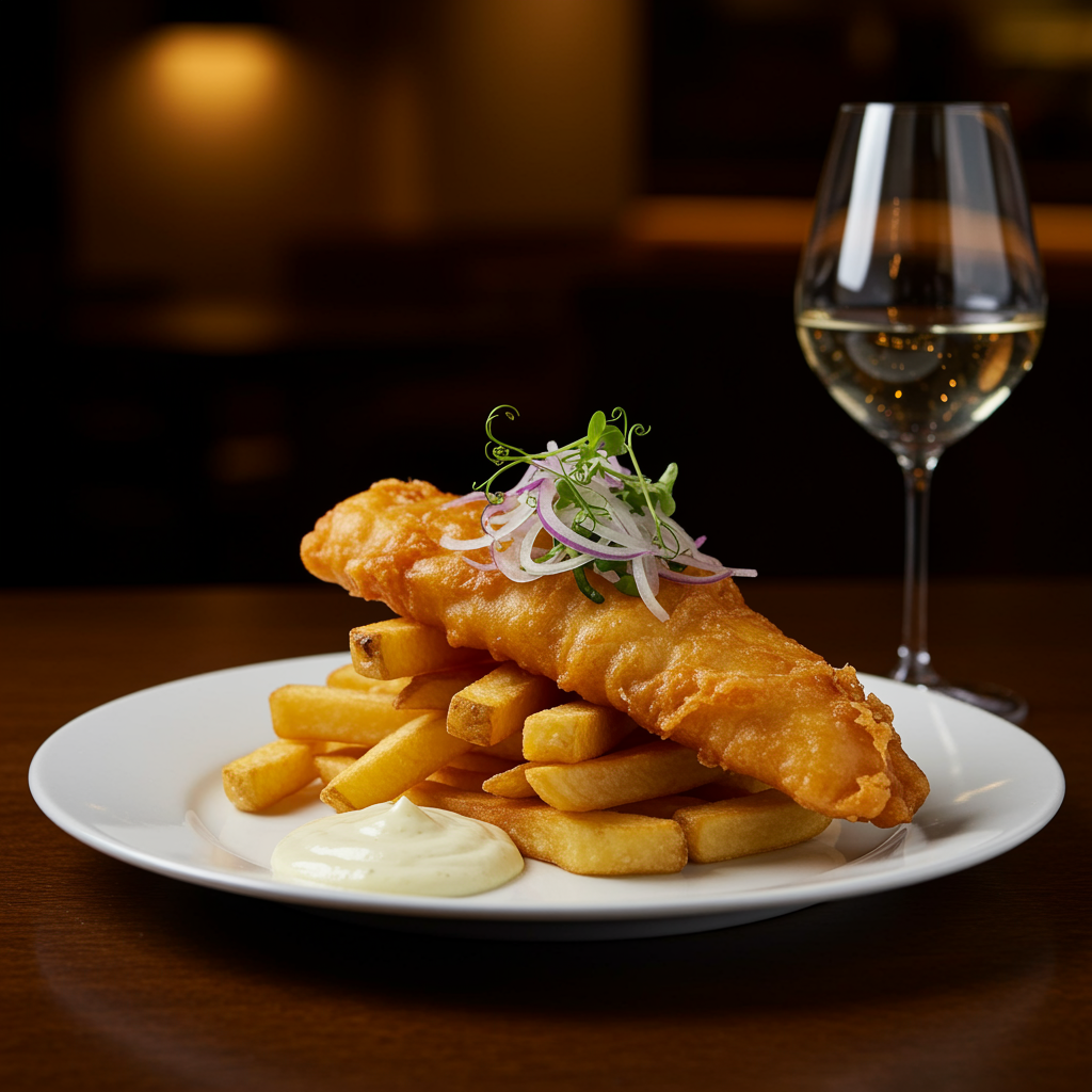 Style: close-up shot | genre: gourmet | emotion: enticing | scene: elegantly plated fish and chips | tags: high-end food photography, clean composition, moody lighting, sophisticated, refined, appetizing, decadent, gourmet cuisine | camera: nikon z7 | focal length: 105mm | shot type: macro | composition: centered focus | lighting: soft ambient light | production: culinary stylist | time: evening ambiance | location type: upscale interior with warm tones --ar 3:4 --v 5
