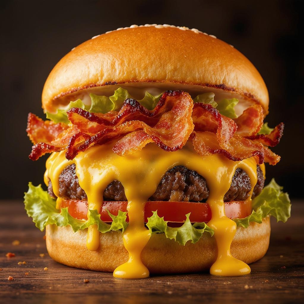 View this AI-generated image featuring sumptuous hamburger featuring crispy bacon fresh lettuce ripe tomato and gooey melted cheese promotional visual ultra quality product showcase vibrant full color highly detailed render irresistibly mouthwatering. Created using advanced AI technology, this image