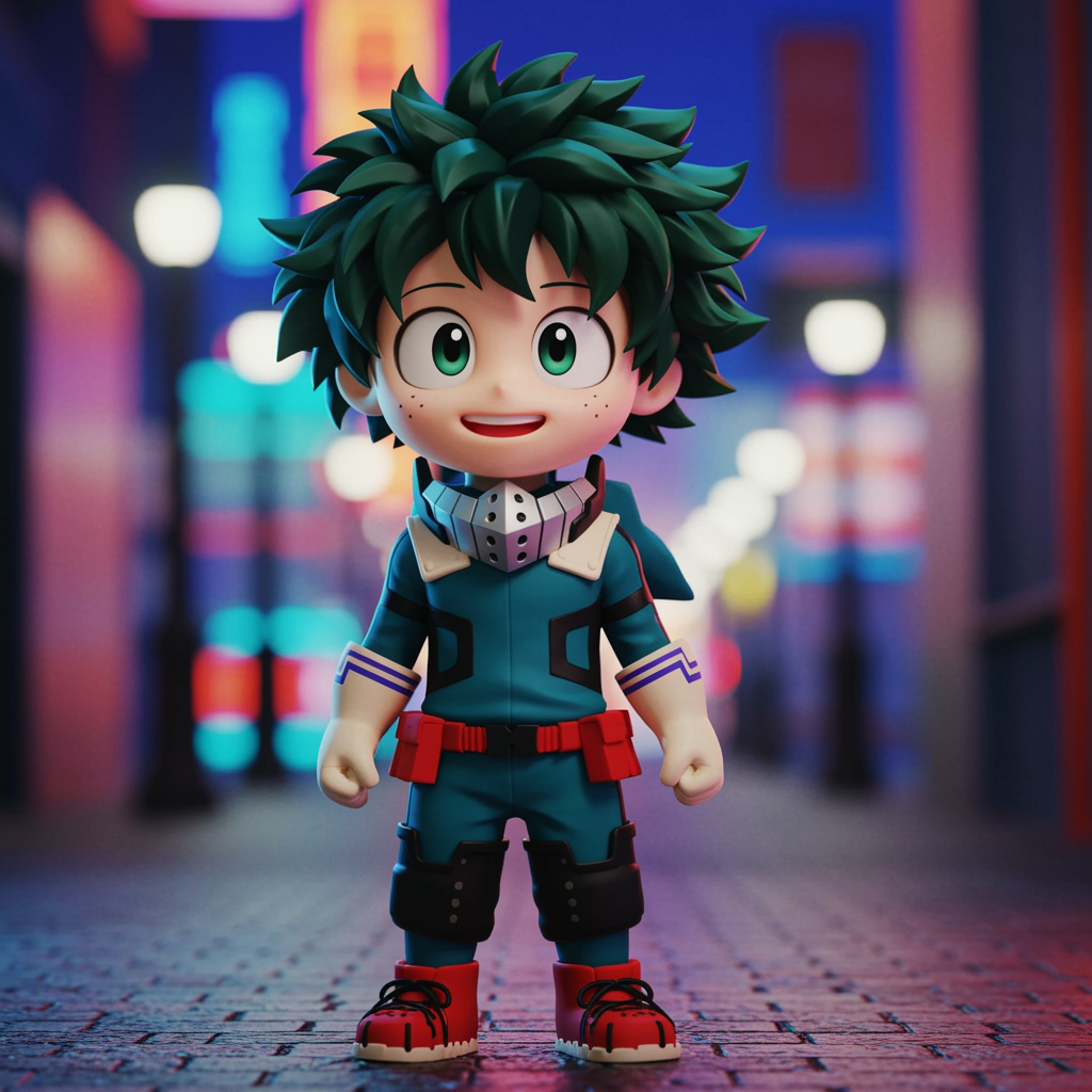 View this AI-generated image featuring super cute izuku midoriya in a full body 3d image standing on a vibrant city street with large expressive eyes that convey happiness and charm the scene is illuminated by bright street lights that enhance the cheerful atmosphere izuku is styled in a chibi form