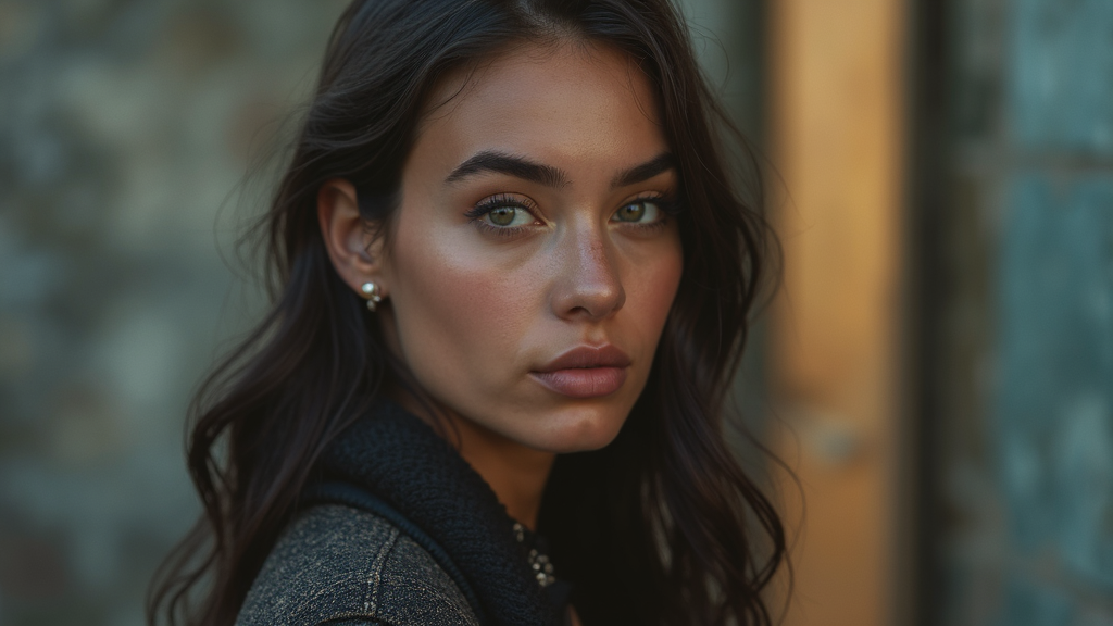 Super-realistic portrait of Nataliya Aleksandrov standing at a photoshoot location, wearing a detailed textured chic casual outfit, cinematic lighting with striking accent highlights, captured with a 35mm lens, her beautiful head slightly outside the frame, avoiding any elements of worst quality, low resolution, unattractive features, poorly drawn or distorted aspects, ensuring natural fingers, well-exposed and visually appealing.