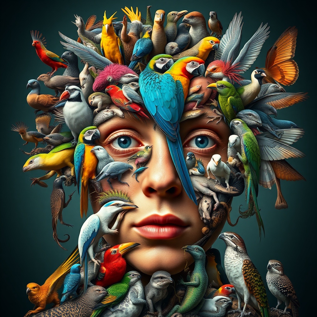 A mesmerizing, surreal portrait of a person intricately formed by a diverse array of animals, each species meticulously positioned to emulate facial features, skin textures, and hair patterns. This harmonious ensemble of creatures, including vibrant birds, graceful mammals, and exotic reptiles, is reminiscent of the artistic genius of Arcimboldo, where natural fauna seamlessly converge to craft an extraordinary, lifelike human visage.