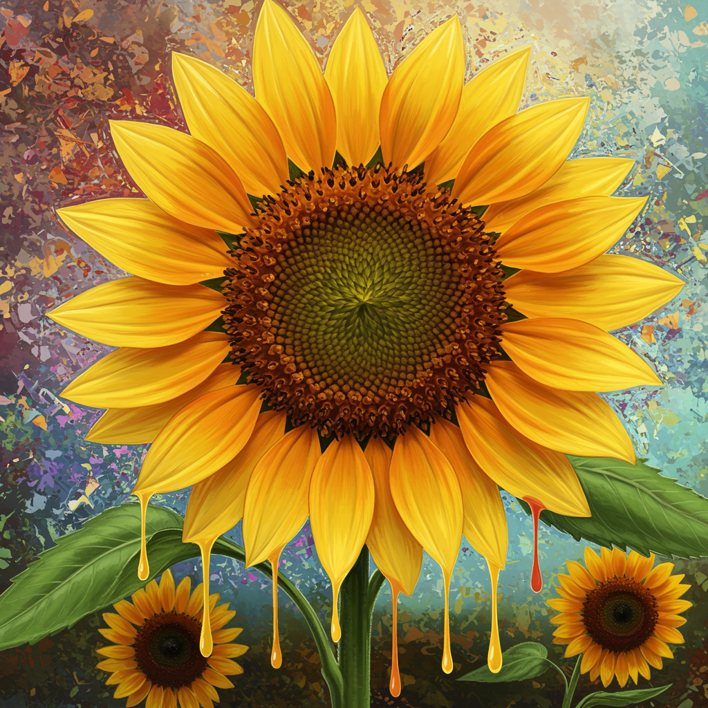 A psychedelic surrealist painting of a sunflower with elongated, melting petals reminiscent of Salvador Dali's dreamy distortions, infused with the fragmented abstraction of Pablo Picasso. The sunflower drips vivid colors, with surreal swirls and cascading hues that blend into an otherworldly garden. Its center swirls hypnotically, creating a sense of infinite depth, while the background pulses with dynamic, kaleidoscopic patterns, capturing the whimsy and fluidity of surreal dreamscapes.