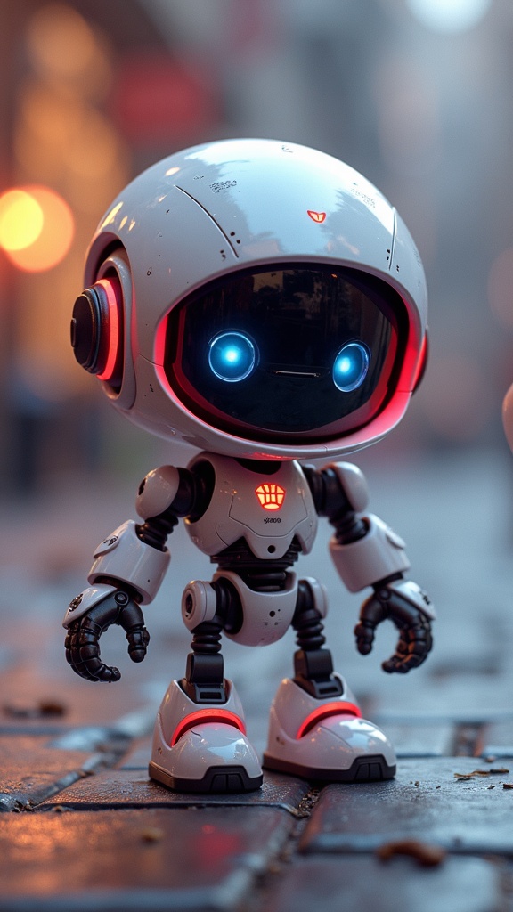 Tiny robotic character, endearing, Pixar-inspired, rendered in Unreal Engine, futuristic Tron aesthetics, exquisitely detailed, immersive volumetric lighting, adorable proportions, vibrant colors, intricate design elements, soft and inviting atmosphere, evokes curiosity and wonder.