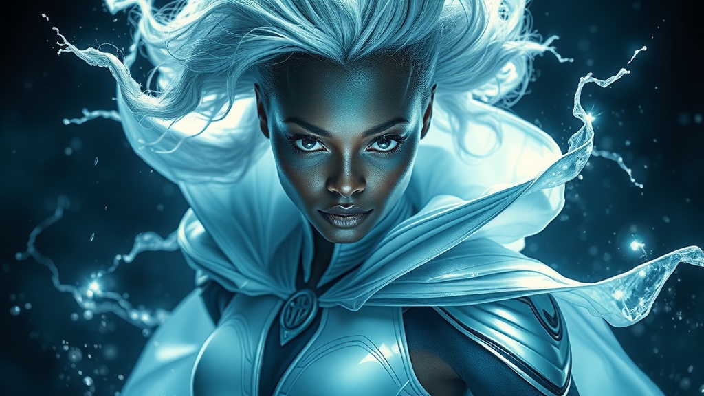 Transform into an extreme vivid fantasy realism style art piece, an ultra-detailed masterpiece portraying Storm from Marvel Inc., captured in hyper-realistic fantasy digital photography. This depiction is meticulously crafted with precision, centered to ensure perfect composition. The use of overexposed photography creates a striking and ethereal atmosphere while maintaining sharp focus to highlight exquisite details. Clear and luminous elements accentuate her iconic white attire, with eyes that are expressive, embodying both power and compassion. Her dynamic pose is enhanced by the intricacies of her flowing cape, merging realism with fantasy seamlessly. This artwork celebrates the essence of command and weather control, set in a visually stunning and imaginative environment, with slight creative modifications that enrich the core concept.