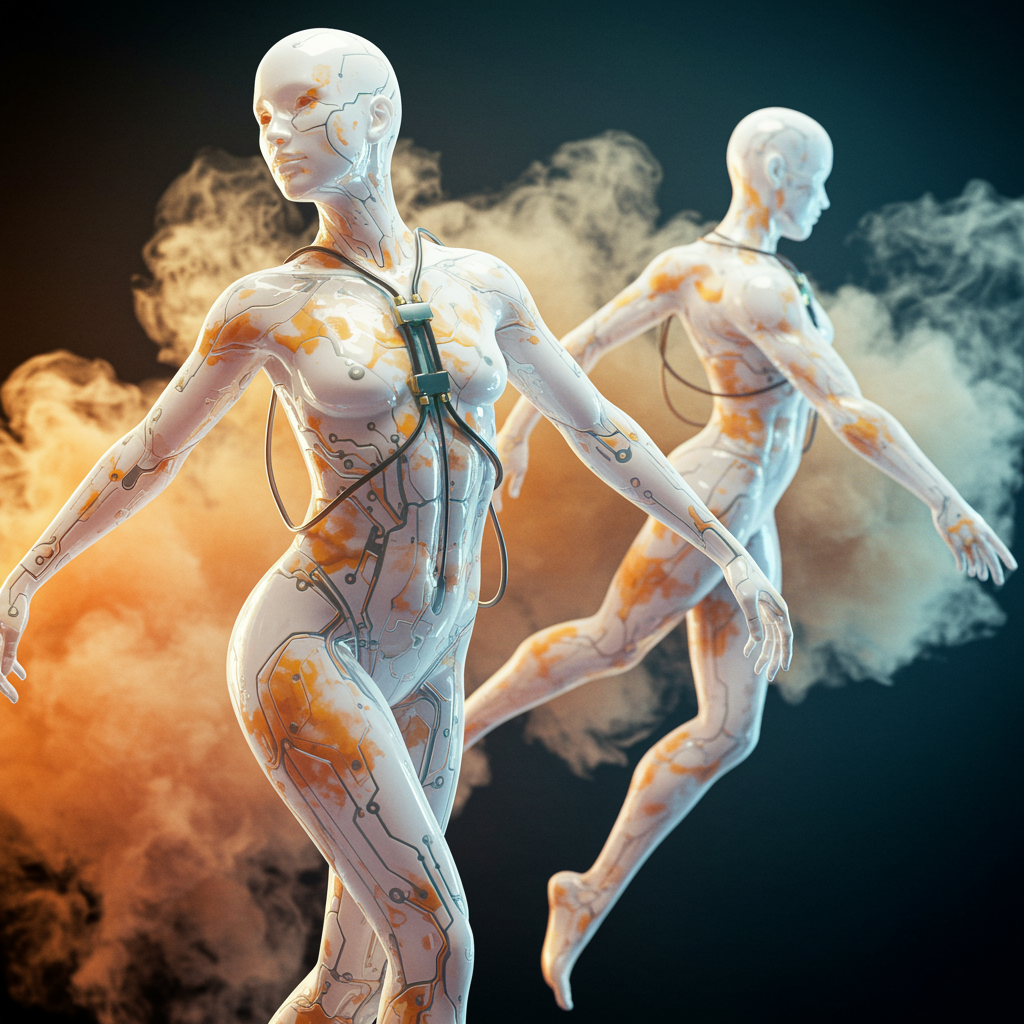 Translucent figures in biomechanical forms, showcasing an elegant fusion of intricate circuits and fluid cooling systems. Their bodies emit a soft, white gradient infused with hues of orange, yellow, and golden smoke, contrasting with the deep blue of crystal-clear liquid running through their veins. The rendering captures every exquisite detail in hyper-realistic style, evoking a sense of stunning beauty and technological sophistication. As the figures move, their surfaces shimmer with an iridescent glow, blending seamlessly into their ethereal surroundings.