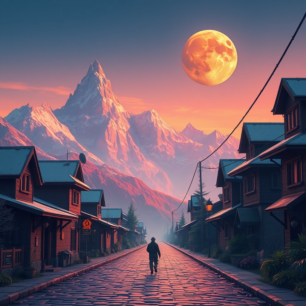 View this AI-generated image featuring a lone traveler meanders down a cobblestone street with majestic mountains towering in the background their peaks dusted with snow reminiscent of a beeple creation this digital masterpiece features an ethereal orange planet and a colossal moon casting a soft gl