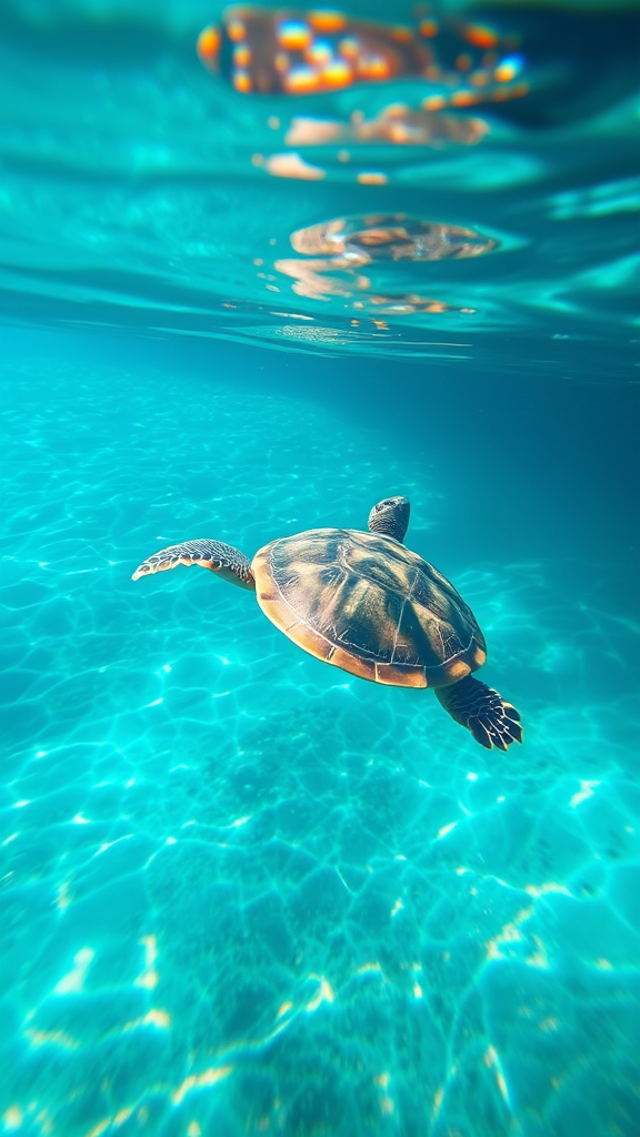 A serene turtle glides gracefully through the crystal-clear waters of a hidden lagoon, sunlight dancing off its patterned shell as it embarks on a tranquil journey beneath the gentle waves.