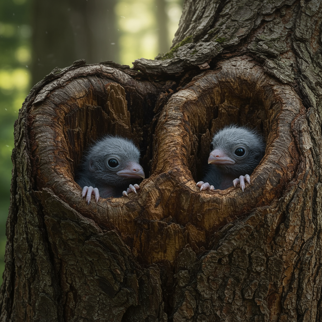Two infant creatures nestled in tree hollows, captured in hyperrealistic wildlife portrait style, inspired by avian themes, akin to the works of Stephen Shortridge and Lilia Alvarado with a touch of Bob Eggleton's imagination. Emphasizing detailed nature studies, the scene showcases intricate elements of wildlife, featuring delicate feathers and textured bark, against a serene forest backdrop. The raw, natural elegance is punctuated by the innocence and curiosity of the young beings, evoking a sense of wonder and connection to the natural world.