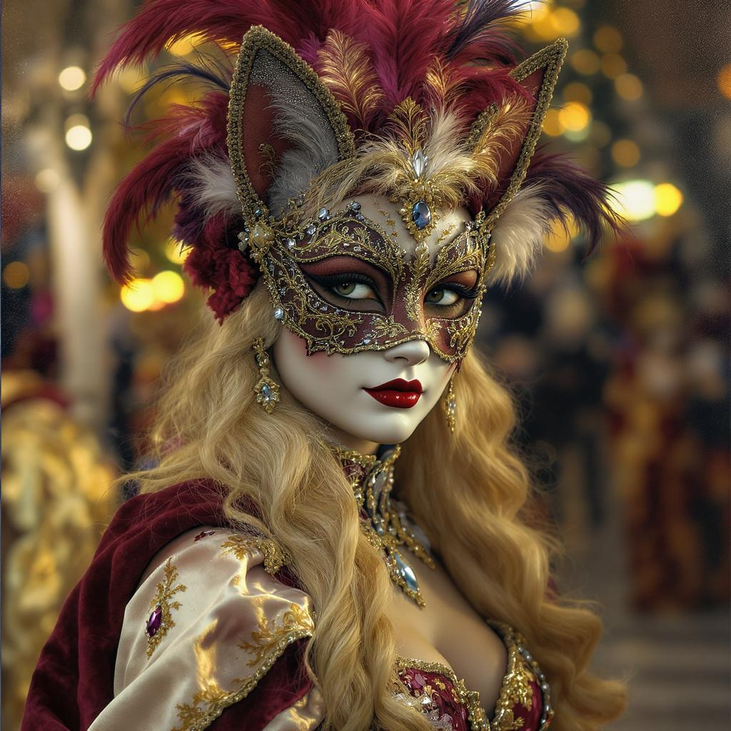 A stunning ultra-detailed, photo-realistic 4k oil painting portrays a woman at the Venetian carnival. She wears an intricately decorated fox mask adorned with delicate golden filigree and adorned with gemstone accents. Her long, flowing blond hair cascades elegantly over her shoulders. The fabric of her costume is luxurious, with rich textures and vibrant colors that reflect the opulence of the festival. Her eyes, visible through the mask, exude a mysterious allure, drawing the viewer into the captivating scene. The background captures the lively atmosphere of the carnival, with softly blurred figures and colorful bursts of light.