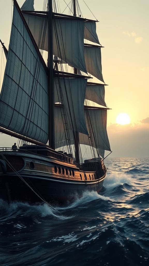 View this AI-generated image featuring ultra realistic painting of a weathered sailing ship at sea captured at a dramatic low angle the scene is bathed in the soft glow of a pale sunrise with cinematic lighting enhancing the detailed textures of the ship s battered sails and barnacle encrusted hull