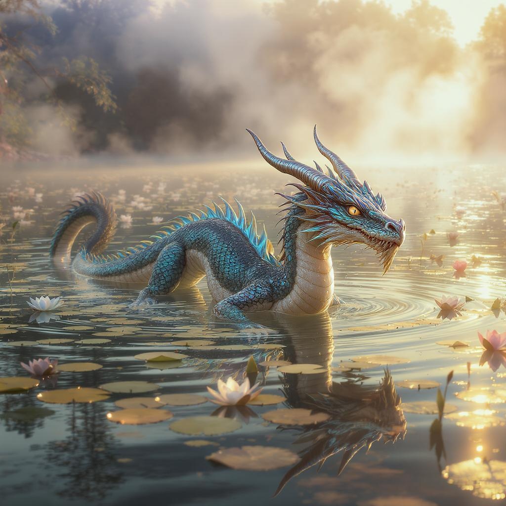 A hyper-detailed, ultra-realistic photograph of a breathtaking anthropomorphic female dragon gracefully wading through the crystal-clear waters of a serene lake. Her iridescent scales glisten in the sunlight, creating a mesmerizing play of colors that ripple across the water's surface. The composition captures the dragon's enchanting, expressive eyes that convey a sense of wisdom and strength. Surrounding her are delicate water lilies gently floating, adding a touch of softness to the striking scene. The mist rises subtly from the lake's surface, catching the golden light of the setting sun, which casts an ethereal glow over the entire landscape in glorious 32k UHD resolution.