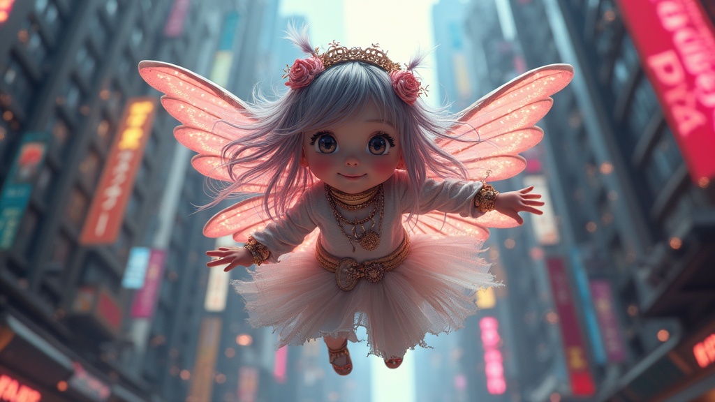 Upper body front view portrait, cinematic shot, dynamic pose, centered, inspired by Carne Griffiths, of a small, happy, energetic figure with an elegant presence, flying through a detailed cyberpunk city. The figure wears fantasy priest attire and intricate accessories, with fairy wings and long hair, set against an ultra-detailed cyberpunk city backdrop. Emphasize cinematic, dynamic, and studio lighting with neon and volumetric effects. Create a sense of a masterpiece with professional quality. The subject exudes childlike wonder while maintaining an anime-influenced style. Avoid deformities or disfigured features, ensuring proper anatomy and expression, with clear, focused visual elements and no extraneous details or imperfections.