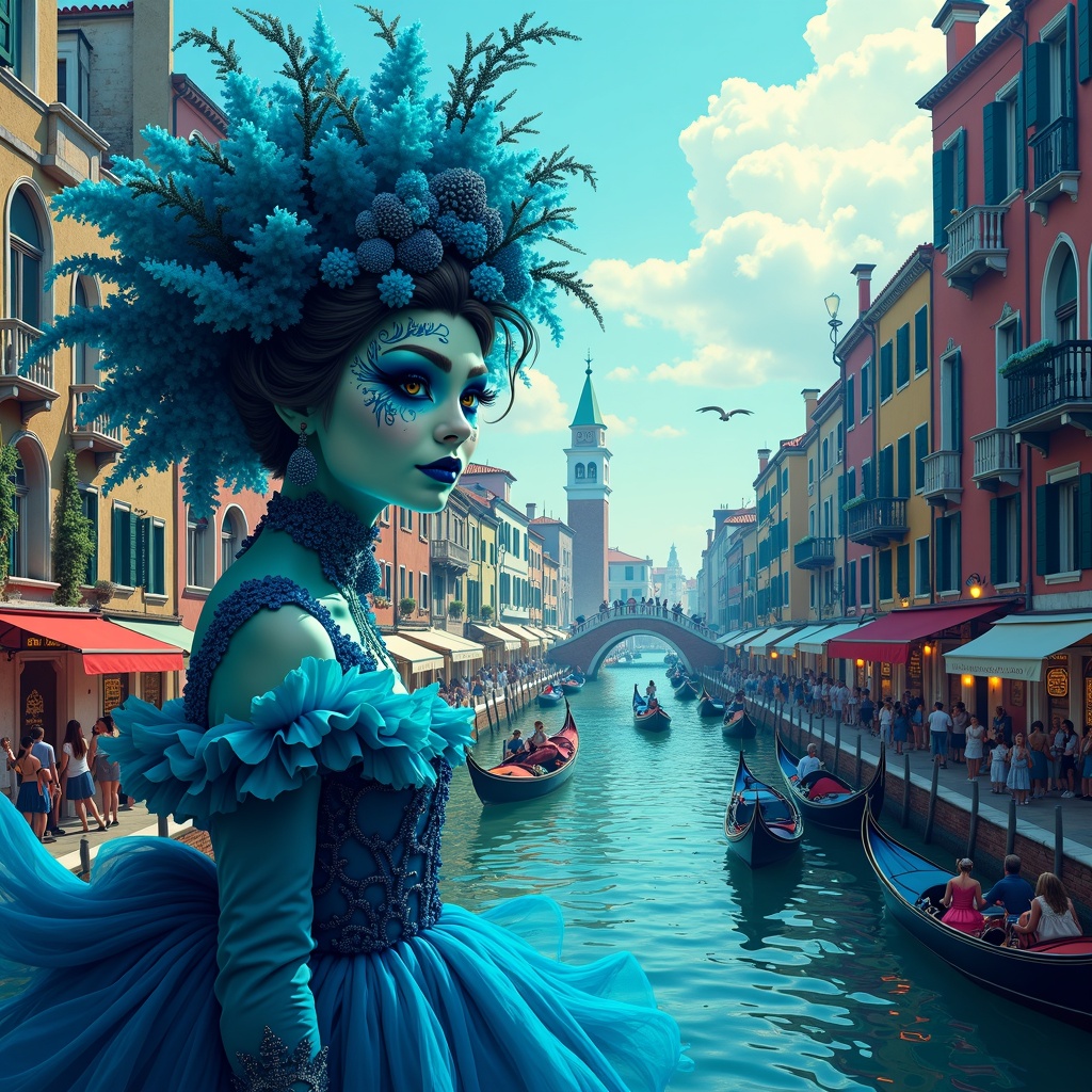 View this AI-generated image featuring venice during a vibrant carnival scene 3 captured in the style of whimsical compositions bursting with color and striking visuals featuring harmonious arrangements in shades of deep blue and sea green with unique facial features and gothic elements the image pr