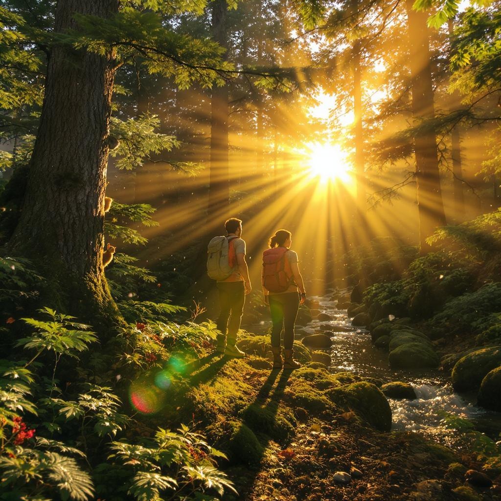 In a dense, verdant forest bathed in the golden light of a setting sun, two adventurous characters stand amidst towering trees and whispering leaves. The vibrant greens of the foliage contrast with their rugged outdoor gear. In the distance, a gentle stream winds through the underbrush, its soft babbling mingling with birdsong, creating a serene, yet invigorating atmosphere. Playful woodland creatures peer curiously from behind the trunks, adding a touch of whimsy to the enchanting scene. Dust motes dance in the sunbeams that filter through the canopy, painting a picture of tranquil exploration and natural beauty.