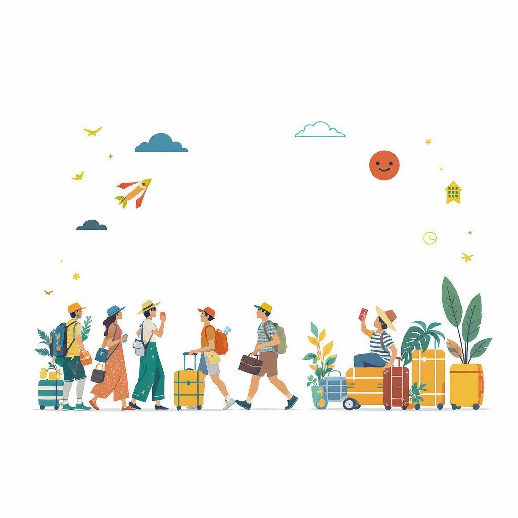 Vibrant tourism scene showcasing dynamic movement, featuring a diverse array of colors against a crisp white backdrop. The composition highlights minimalist design elements with simple shapes in a flat design, exuding a sense of freshness and vitality, suggestive of lively travel experiences and discovery.