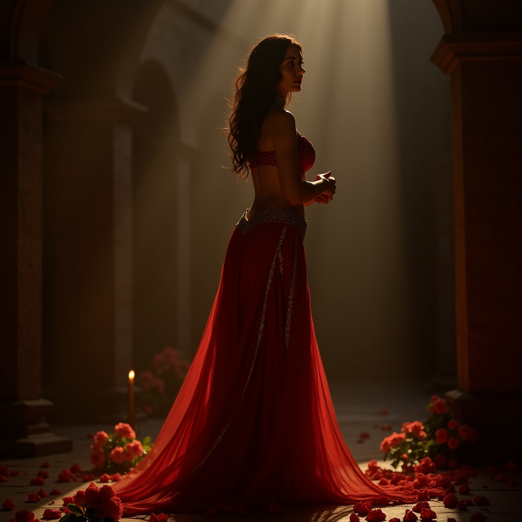 A mesmerizing vision stands in the medieval castle courtyard just as twilight descends, her radiant presence is accentuated by the interplay of full moonlight, torchlight, and candlelight. She is adorned in a splendid belly dance ensemble of deep red and shimmering gold, the hues glimmering in the soft, enchanting glow. The vivid flowers around her barefoot stance are caressed by silvery beams. Her raven-black, wavy hair cascades down to her hips, soft curls catching the moon's gentle light. An enigmatic black choker graces her neck, adding allure. She stands with her back to the camera, turning her head slightly to cast a magnetic, inviting gaze over one shoulder, her deep eyes captivating the observer. Captured using a Leica M10 and Helios-44 58mm f/2 lens, the photograph is a symphony of colors and depths, with the aperture stopped at F2.8 to blend rich tones with delicate highlights. The warm midday sunlight, diffusing through her flowing hair, enhances her silhouette's elegant curves and contours, creating an image where beauty and mystery harmoniously converge.