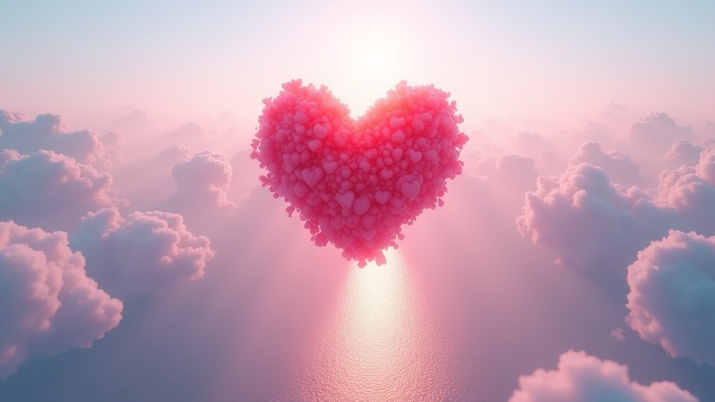 A breathtaking vision unfolds as a striking red heart emerges amidst the clouds over a shimmering expanse of water, evoking awe with its ethereal beauty. Rendered in the intricate, sculptural detail of ZBrush, this scene is bathed in soft hues of light pink and sky-blue, blending seamlessly together. The spectacle is so stunning it defies belief, reminiscent of hyperbolic expressions of NYC's breathtaking skyline viewed in expansive coverage, all dynamically captured in the photorealistic power of Unreal Engine 5. Inspired by the enchantment of Robert Bissell's artistry, this composition transcends the ordinary, inviting viewers into a realm where imagination and reality collide.