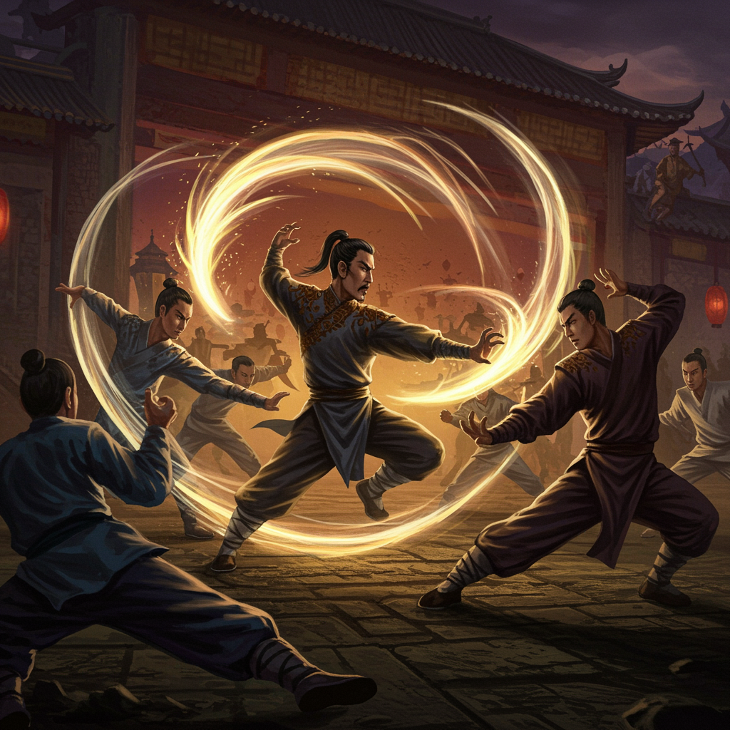 View this AI-generated image featuring vivid painting of a dynamic chinese kung fu duel a lone kung fu master skillfully battling a group of martial artists swirling energy flow creating striking visual effects intense detail showcasing agility and explosive movement in the style of jaime jones 50mm