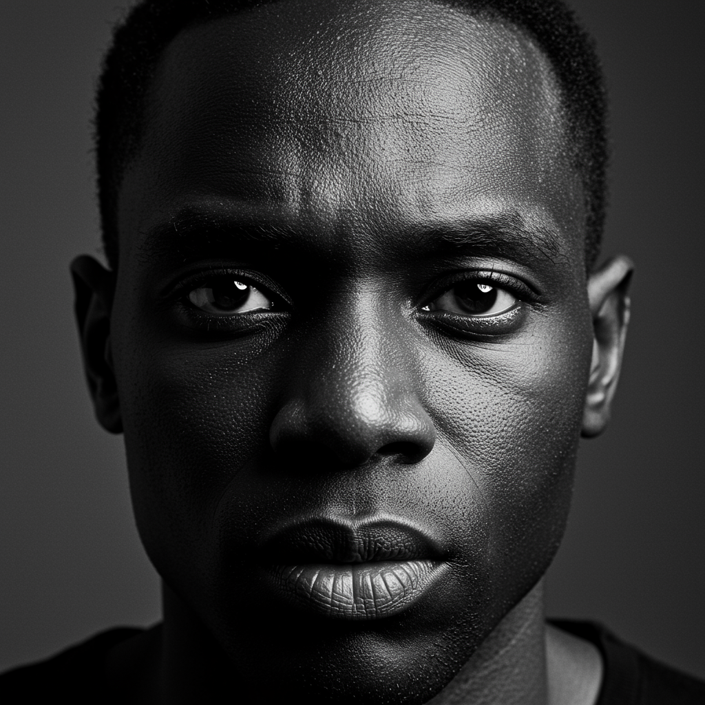wallpaper, high-resolution image of a black man gazing intently at the camera, intimate close-up, monochrome, captured with Leica 50mm lens, f1.2, showcasing intricate skin textures and depth