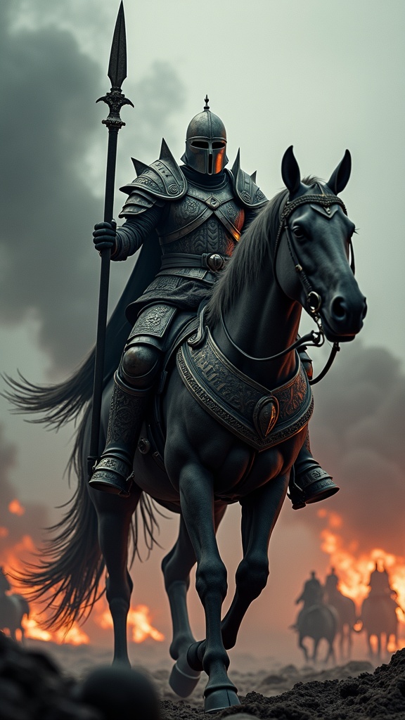 View this AI-generated image featuring a fearsome warrior clad in intricate full battle armor rides atop a monstrous warhorse amidst a chaotic conquest scene the setting is dark and filled with horror with elaborate design details emphasizing the terror of battle captured with cinematic photography