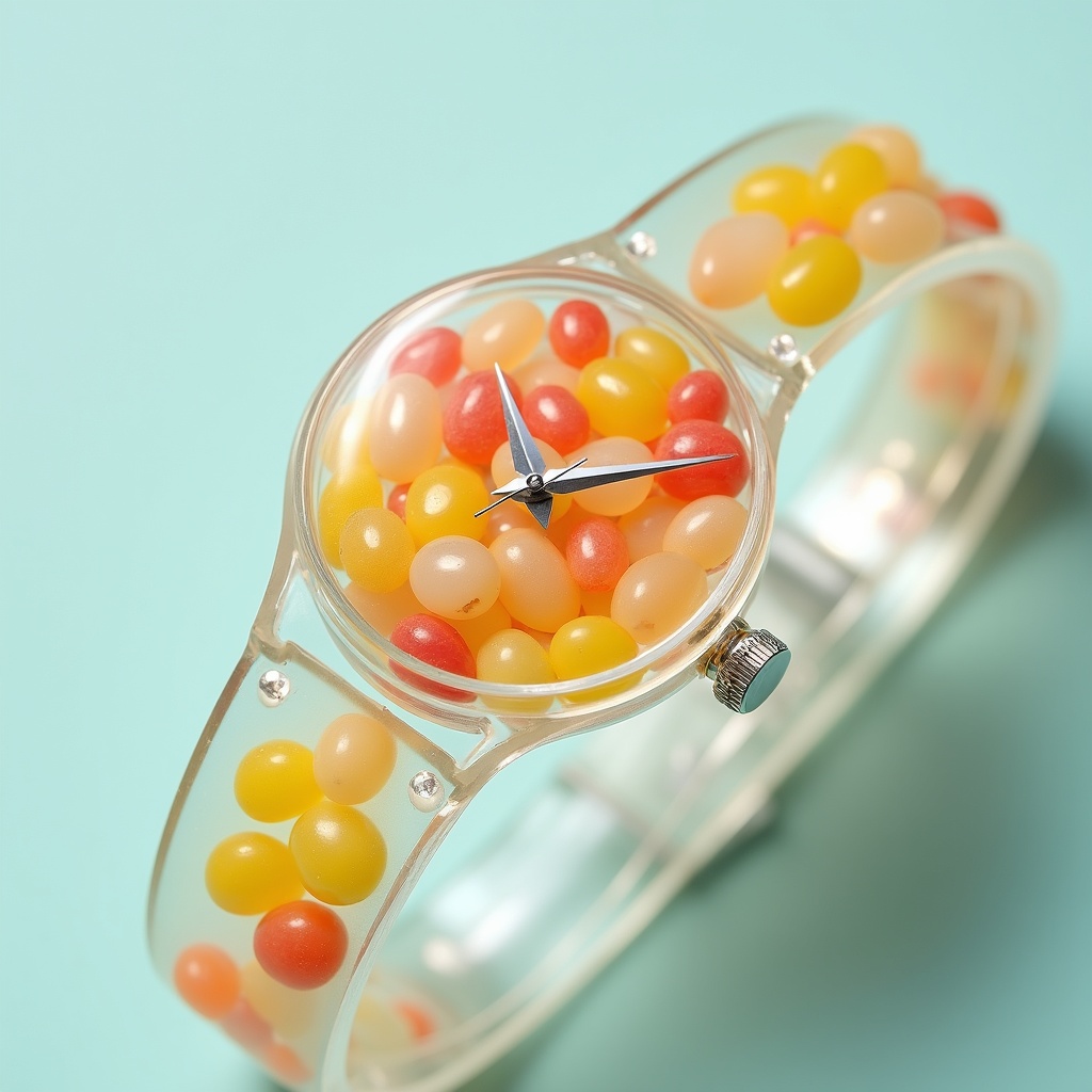 View this AI-generated image featuring watch top down cinematic fine art photoshoot in a professional studio setting featuring an exquisite transparent vinyl wristwatch crafted from translucent glass the interior is filled with an array of vibrant small jelly beans enhancing the watch s allure the d