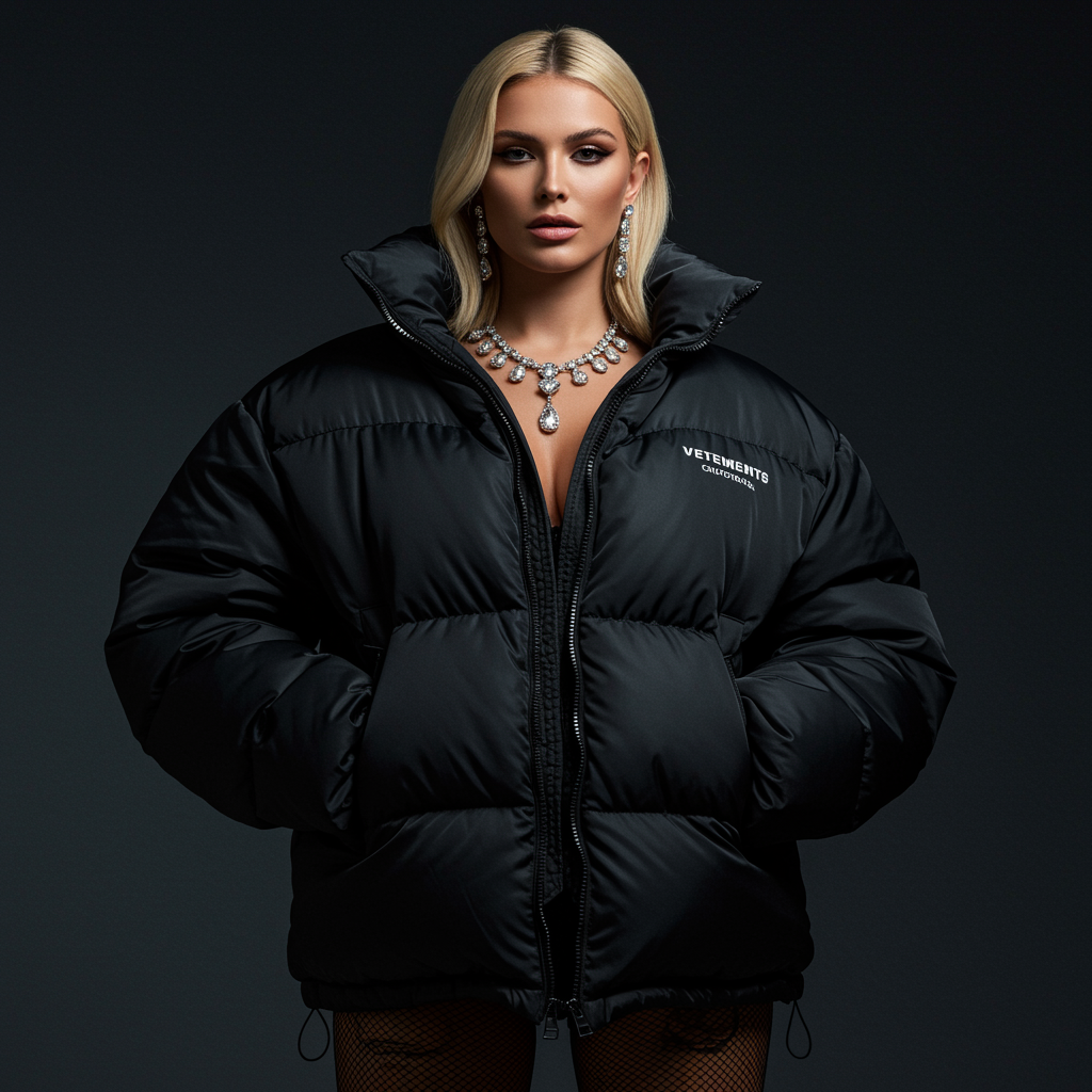 Well-lit fashion shoot portrait of a stunning woman wearing an exaggeratedly oversized puffer jacket designed by Balenciaga, Vetements, and influenced by Craig Green and Dingyun Zhang. The image is in sharp focus, with clear and detailed cinematic quality. The styling is glamorous and symmetrical, embodying a Vogue editorial aesthetic with a glossy, high-fashion magazine feel.