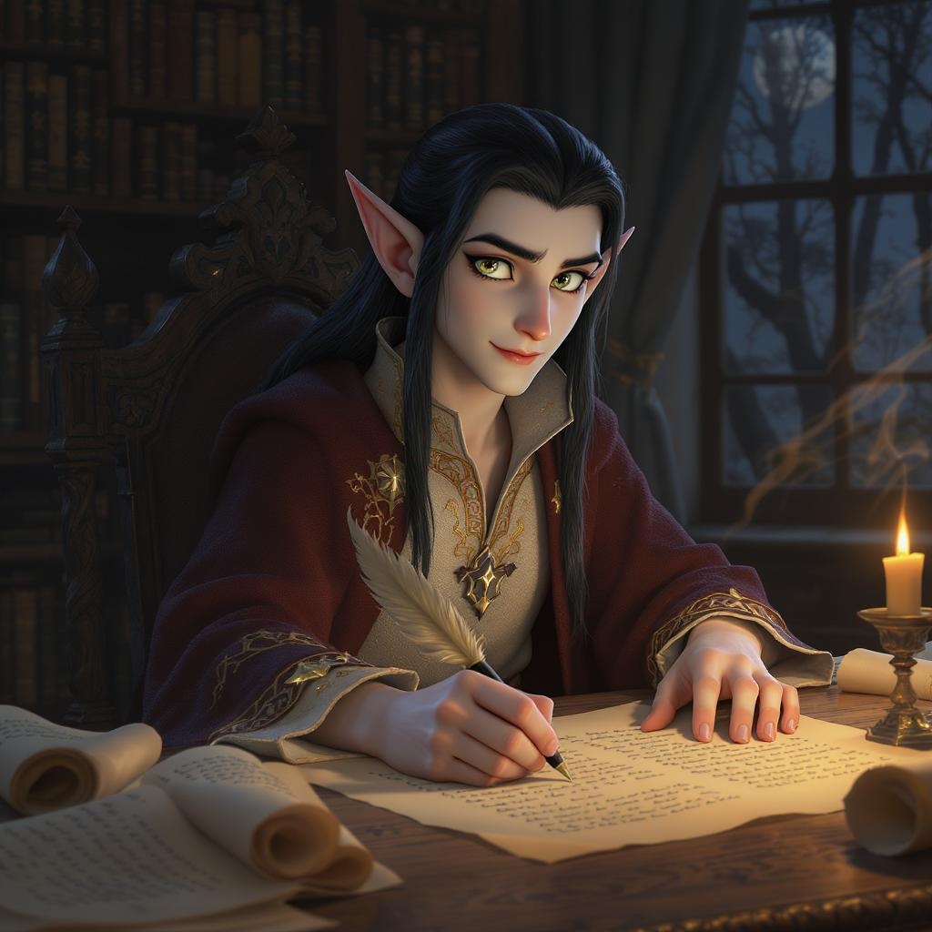 A young white elf with alabaster skin and remarkably long ears, ebony black hair cascading down his back, and enchanting gold-flecked green eyes. This wizardly scribe and scholar is adorned in a stunningly beautiful robe that exudes an air of ancient wisdom. His intricate eyes, brimming with knowledge, observe the world with a serene intensity. Rendered in a breathtaking 8k Pixar high resolution style, the scene captures him with cinematic Ghibli studio lighting and a Rembrandt light touch, immersing the viewer in a fairy tale realm.