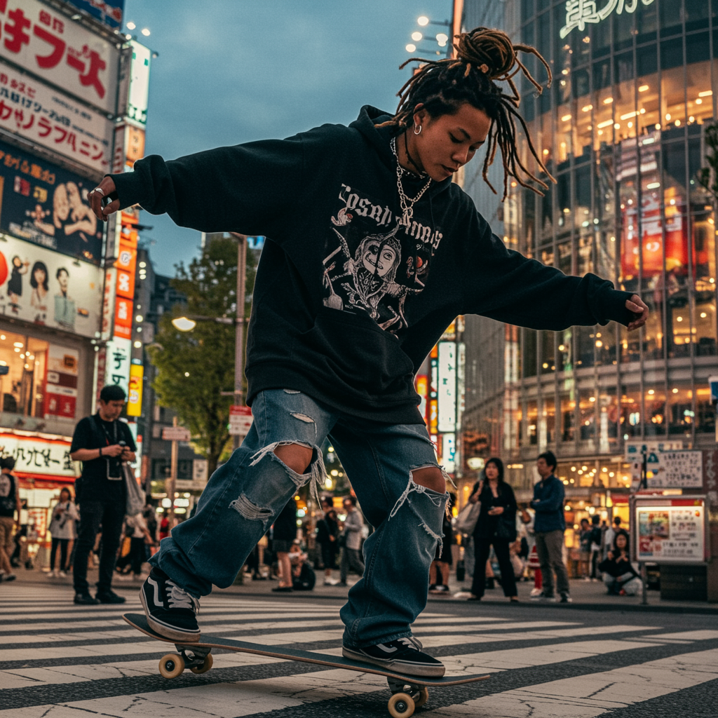 View this AI-generated image featuring a dynamic wide angle low angle action photograph of a stylish young japanese woman skateboarding through the iconic shibuya crossing in tokyo at dusk her long dreadlocks trail behind her capturing the essence of motion she s dressed in an oversized black graphi