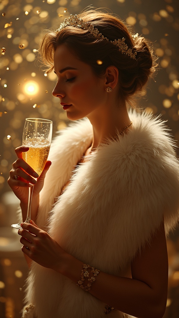 View this AI-generated image featuring wide shot character portrait of an elegant socialite a beautiful woman exuding 1920s gatsby party glamour adorned in a stunning art nouveau ermine stole her attire is classy featuring delicate feathers and holding a glass of champagne amidst a cascade of gold c