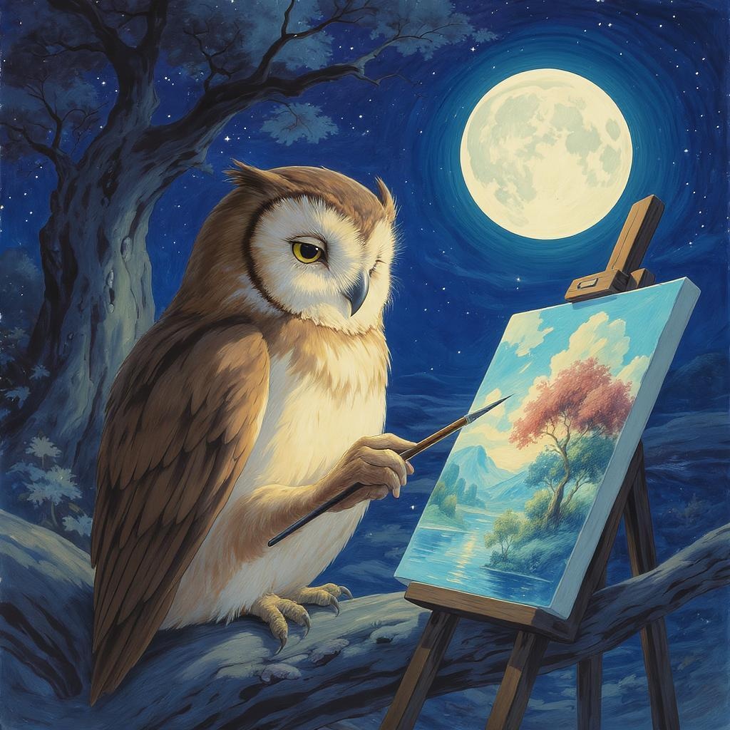 A tranquil, wise owl sits perched, delicately painting a serene landscape with gentle, fluid strokes. Its eyes, full of wisdom and tranquility, convey a calm and peaceful demeanor. The scene is imbued with a serene and magical quality, reminiscent of a Studio Ghibli illustration, yet with the bold lines and distinct style of a Steve Ditko creation. The backdrop is a peaceful, moonlit night, casting a soft glow over the owl and artwork, creating an atmosphere of quiet reflection and creative solitude.