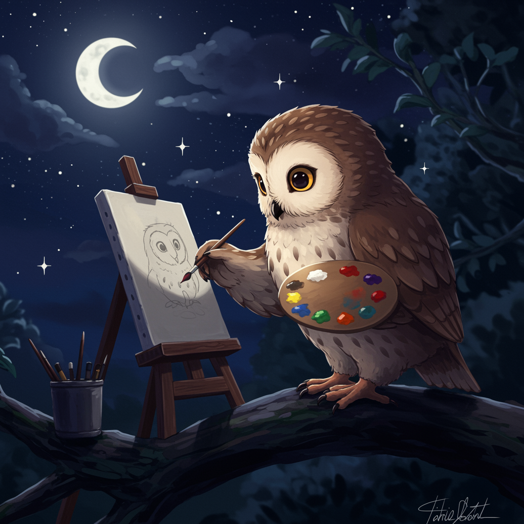 A tranquil, wise owl engages in painting a serene masterpiece, its wise eyes and calm demeanor reflecting a deep serenity. The scene, inspired by the whimsical essence of Studio Ghibli and the distinct style of Steve Ditko, features a peaceful, moonlit background. The owl's feathers softly ripple in the gentle night breeze, and subtle starlight twinkles illuminate its artistic endeavor. Shadows and light play intricately, creating an atmosphere of quiet contemplation and creative focus. The illustration captures the harmony between nature and creativity, enveloped by a soothing, ethereal ambiance.