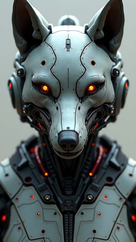 Wolf-inspired cybernetic robot with a highly detailed, symmetrical face featuring intricate mechanical details. Digital 3D rendering with hard surface textures, designed for real-time VFX. This character design is gaining popularity on art platforms, showcased in ultra HD with HDR effects. It includes asymmetrical elements such as sporadic holes and a partially out-of-frame composition. Despite the detailed craftsmanship, there are intentional imperfections such as slightly distorted proportions and a hint of chaotic design, evoking a unique aesthetic. The image includes subtle nods to traditional art with suggestive forms and ambiguous markings, evoking a sense of narrative.