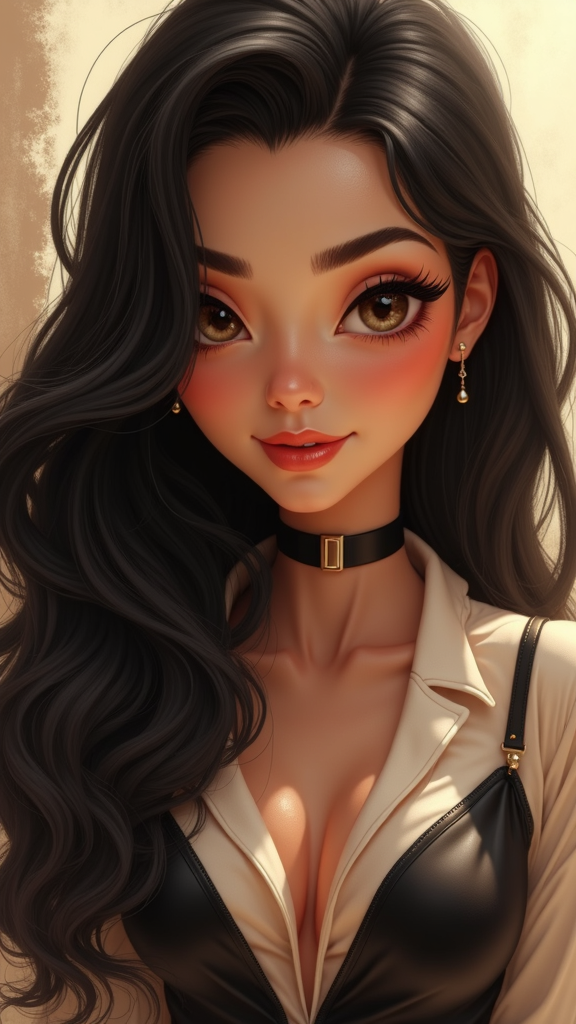 An elegant woman with a detailed, beautiful face and long, lustrous black hair stands out in a vivid scene. Her expression is serene and inviting, complemented by a gentle smile. Her skin is luminous, with a glossy white sheen that suggests a touch of humidity. She's dressed in a stylish ensemble, complete with a chic tie, exuding an air of sophistication. The overall composition is rendered in 3D, with sepia tones enhancing the classic feel, blending elements of painting, cartoons, and sketch to create a captivating visual narrative.
