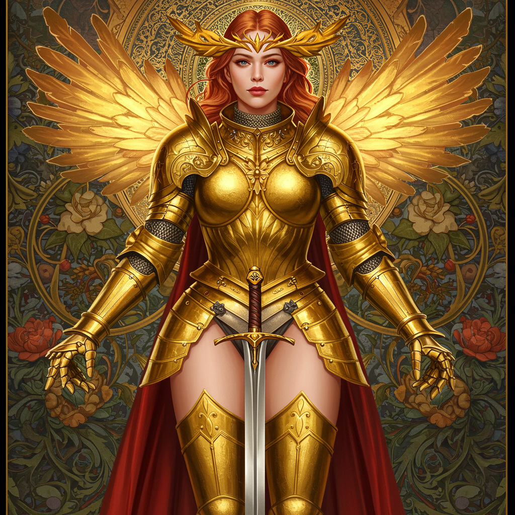 A stunning and powerful woman clad in radiant golden armor, her full form on display with impeccable body proportions. Her face is flawless, framed by luxurious hair, every detail rendered to perfection. This detailed illustration boasts intricate designs and ornate elements, capturing the essence of Johanna Rupprecht and William Morris’s styles, and is highly detailed, reminiscent of an octane render. A poster-quality image, 8k resolution, trending on ArtStation, the depiction combines classical elegance with modern digital artistry, presenting a breathtaking vision of strength and beauty.